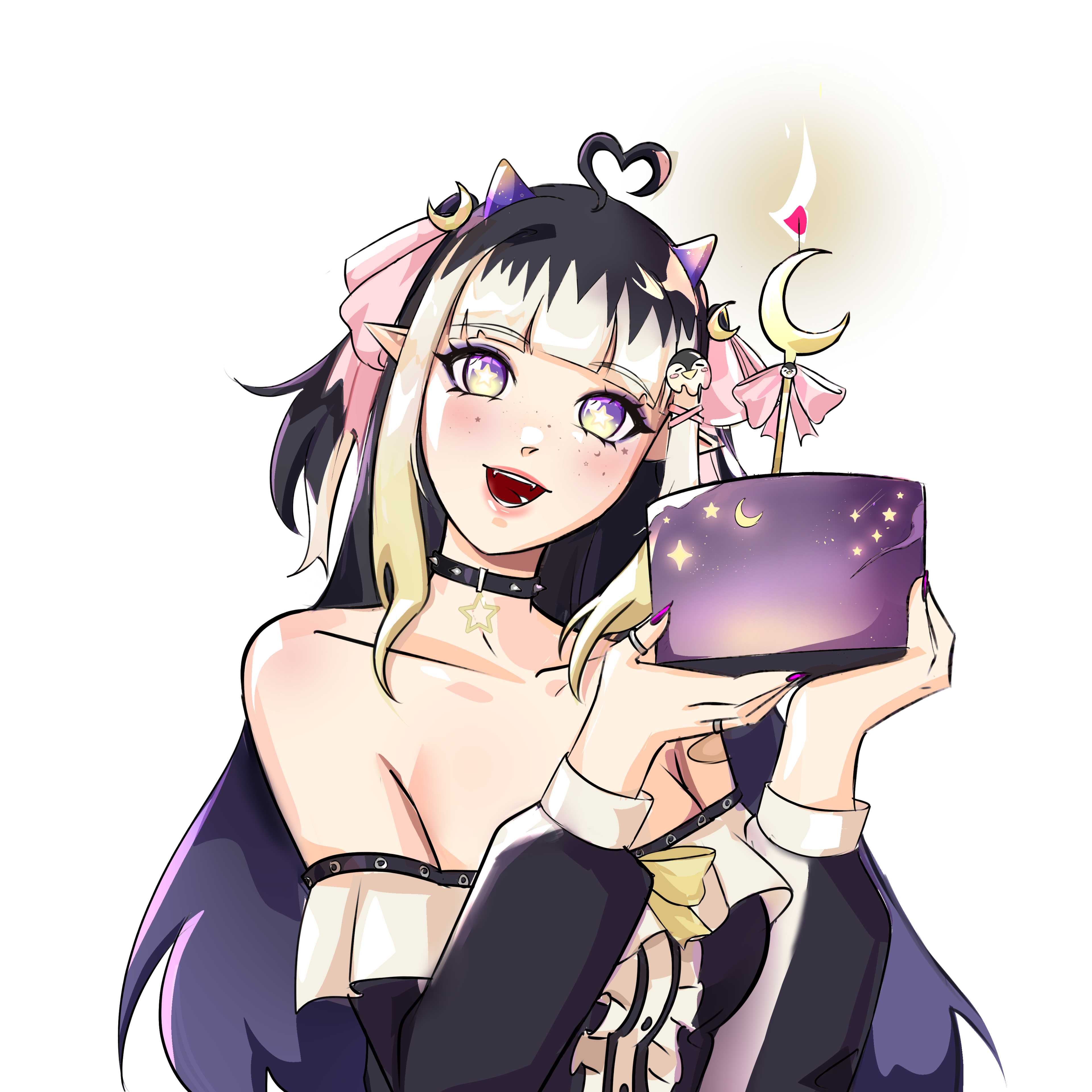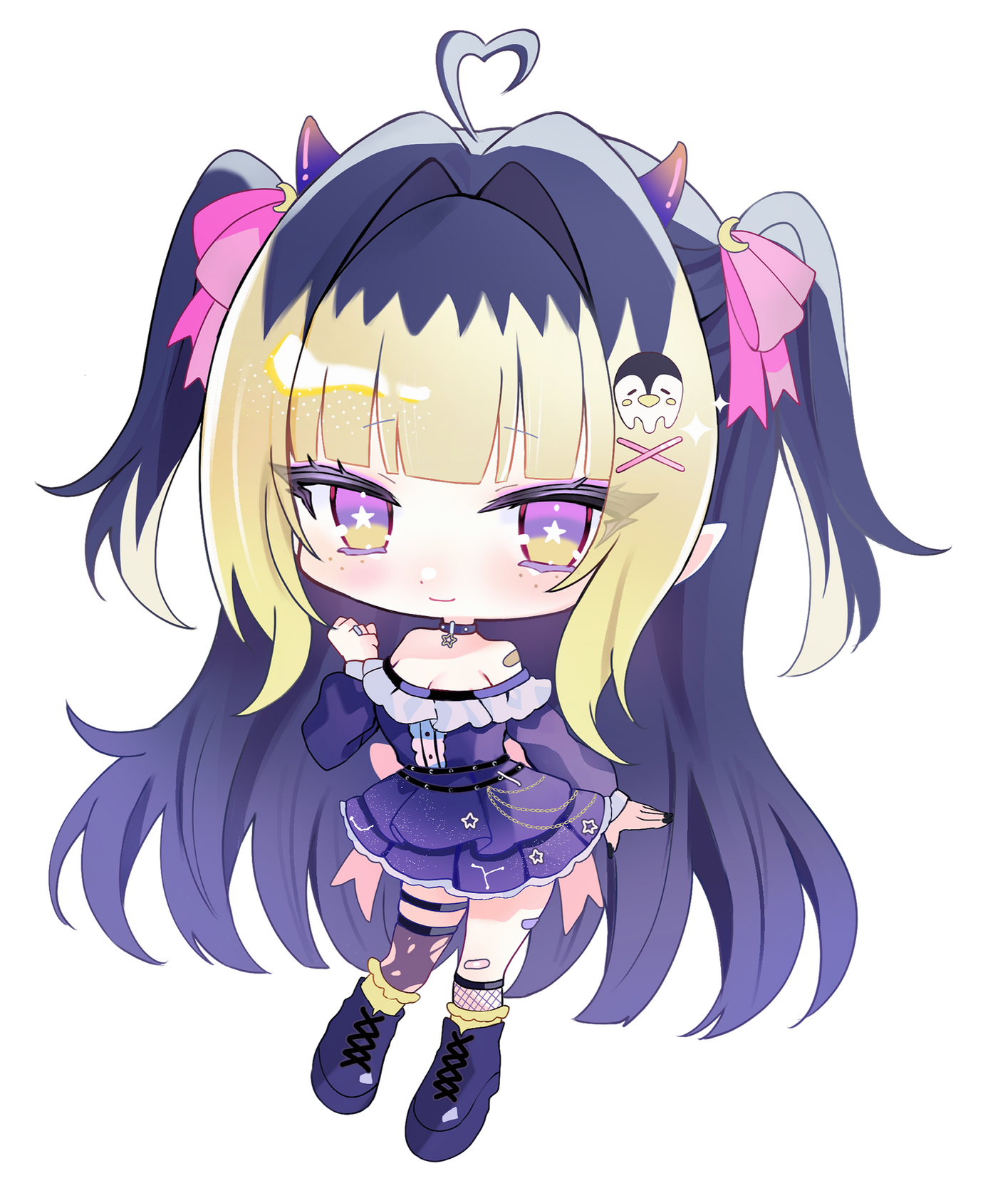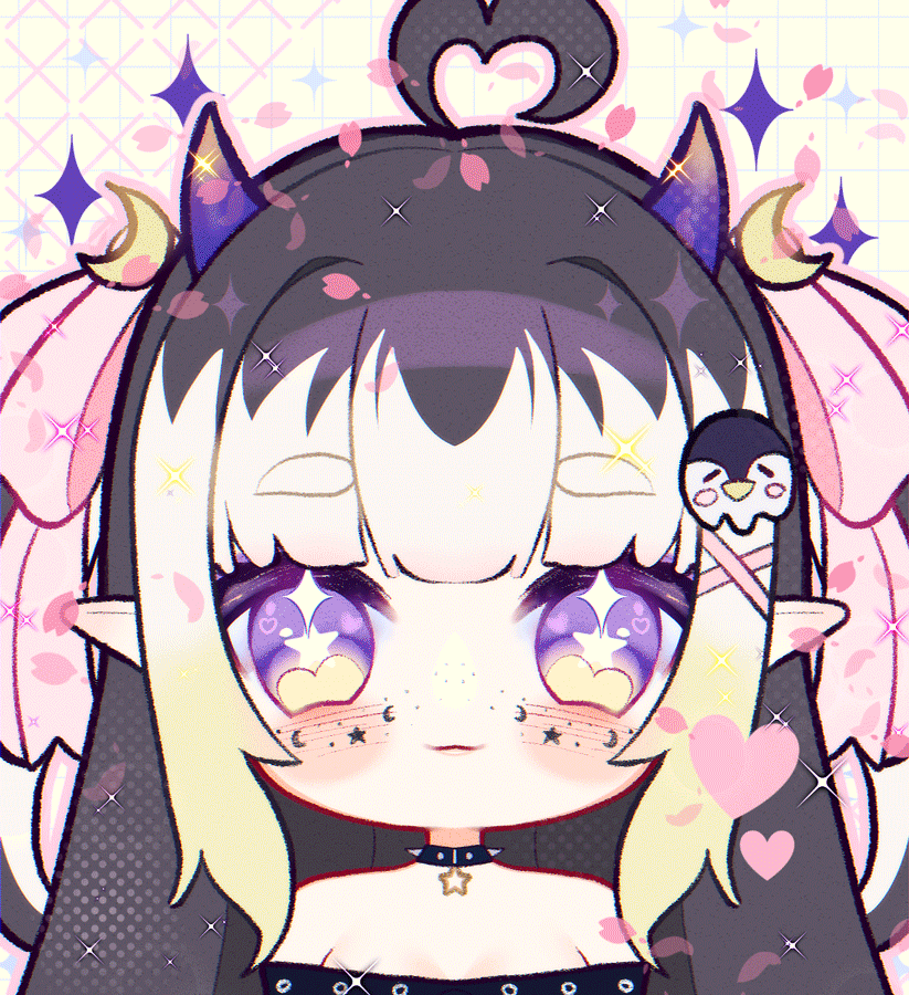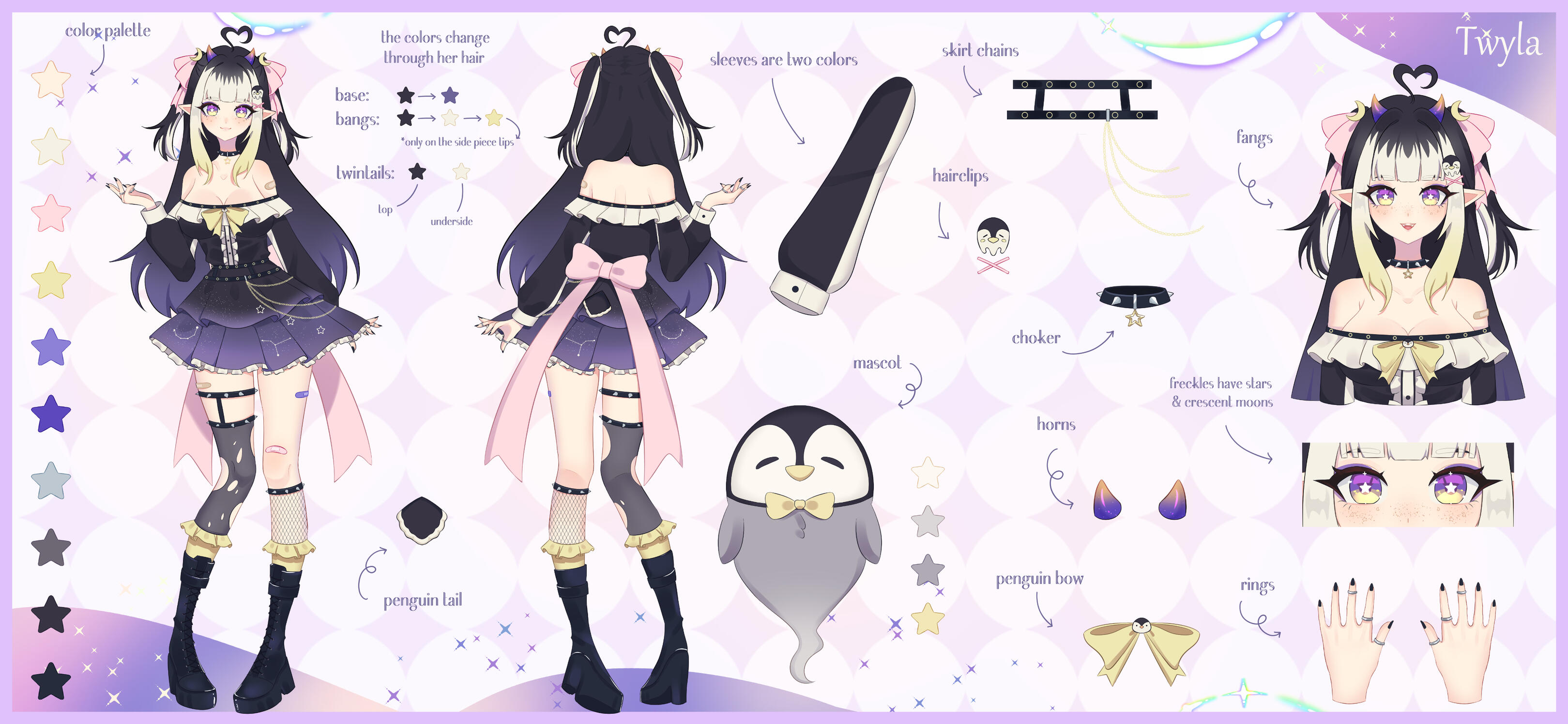 The twilight night sky of the spirit-occupied Afterice is a liar, because as much as it appears to be infinite, it isn’t. Its stars may seem eternal, but even they are sometimes destined to meet their fate in due time. You see, the Afterice’s dark icy waters provide a treacherously freezing climate, one even too cold for some stars to withstand forever.One night, a bright violet star finally succumbed to the frost that clung to its surface for eons. That violet star burst into stardust & died. Floating down to the icy terrain, it sparkled & shifted, twisting its form & quite strangely, it materialized? Birthed from the twilight night sky & the cruel chill of the land, this stardust formed something never seen before… a girl with imp horns & a penguin tail, a penguin imp hybrid. The spirits who haunted the land would later come to call her Twyla, their guide in the Afterice.(More to come...)
