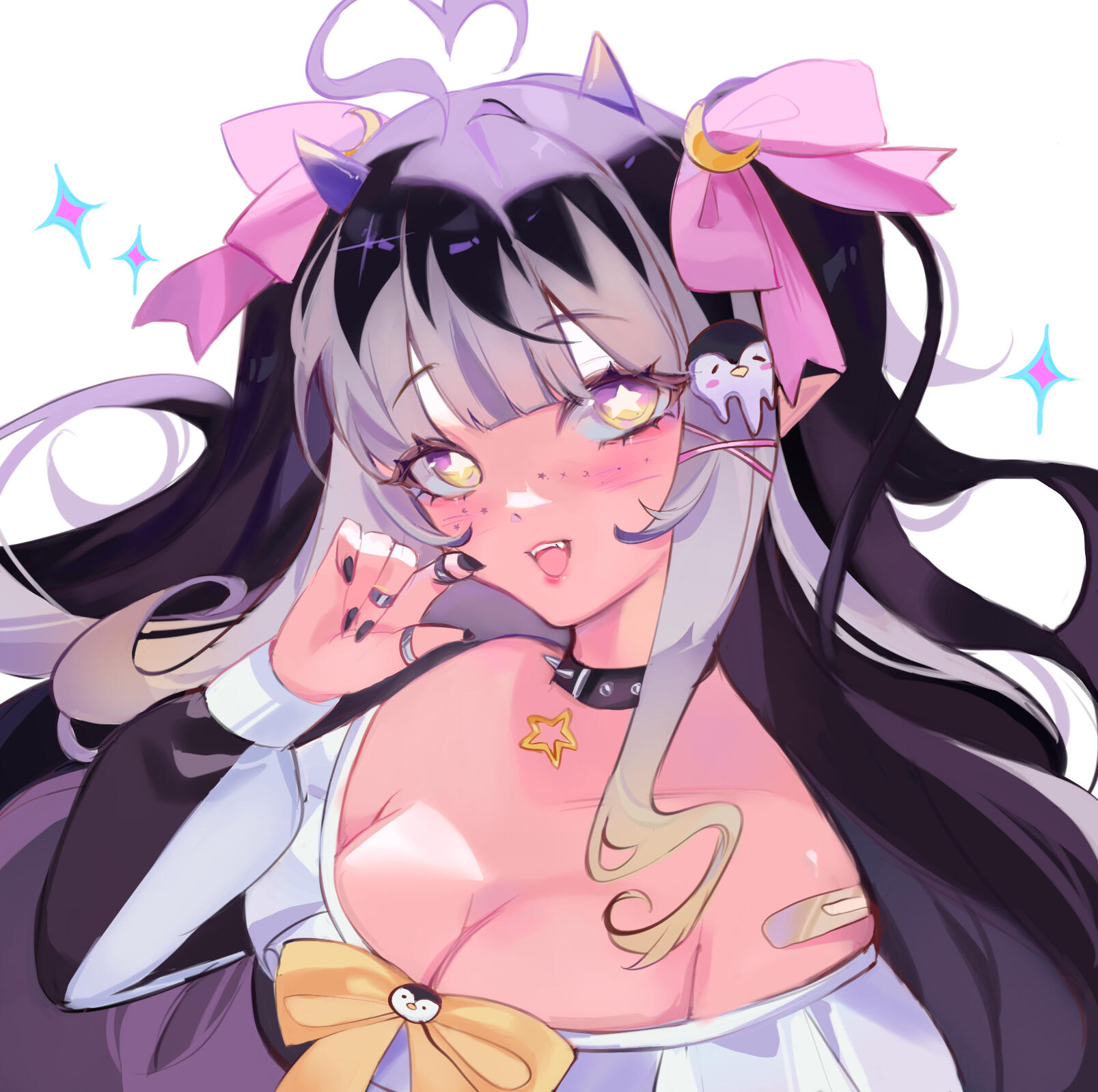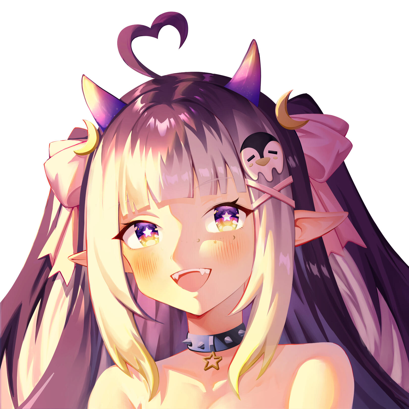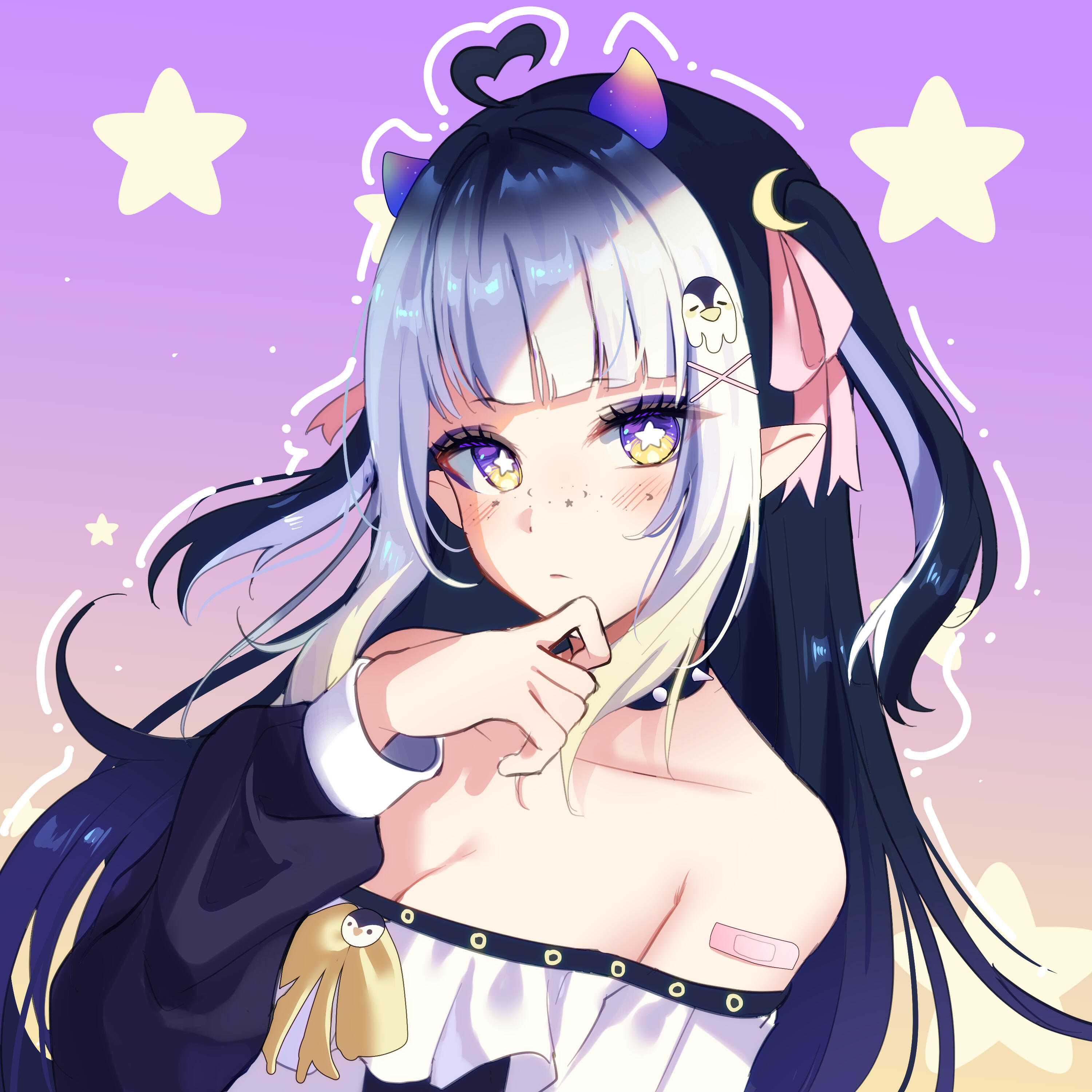 The twilight night sky of the spirit-occupied Afterice is a liar, because as much as it appears to be infinite, it isn’t. Its stars may seem eternal, but even they are sometimes destined to meet their fate in due time. You see, the Afterice’s dark icy waters provide a treacherously freezing climate, one even too cold for some stars to withstand forever.One night, a bright violet star finally succumbed to the frost that clung to its surface for eons. That violet star burst into stardust & died. Floating down to the icy terrain, it sparkled & shifted, twisting its form & quite strangely, it materialized? Birthed from the twilight night sky & the cruel chill of the land, this stardust formed something never seen before… a girl with imp horns & a penguin tail, a penguin imp hybrid. The spirits who haunted the land would later come to call her Twyla, their guide in the Afterice.(More to come...)